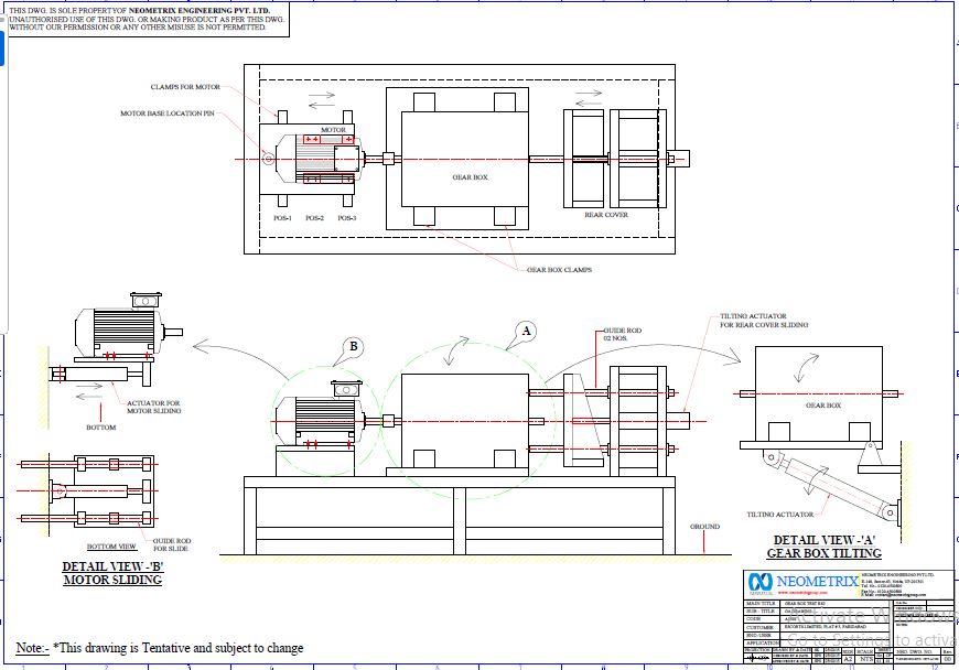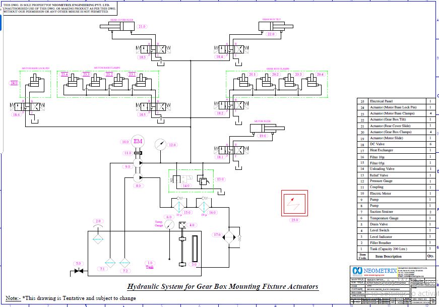 Neometrix Gear Box Test Bench Product Overview The Neometrix Gear Box Test Bench is a purpose-built, skid-mounted rig designed to evaluate and validate gearbox performance across a variety of load, speed, and gear-combination scenarios. Tailored for Escorts Agrimachinery’s PU-Transmission Division, it precisely measures input versus output RPM, torque, and optional PTO shaft speeds on centre-shift, side-shift, 9+3-speed, and DC/TRB gearboxes. Its modular design ensures compatibility across Escort’s full gearbox lineup while simplifying installation and maintenance. System Architecture - Hydraulic Power Packs (HPPs): Two independent units deliver clean, filtered fluid (10 µm suction, 25 µm return) for gearbox actuation and optional anti-rust spray operations. Rated to 250 bar with auto-switching relief and unloading valves. - Mechanical Fixture & Structure: A robust fabricated steel frame houses the gearbox mounting fixture with pneumatic clamps, tilting assembly for oil drainage, and integrated drip tray. Quick-release spline adaptors ensure precise alignment. - Drive & Measurement: A 20 HP VFD-controlled motor (ABB/Siemens) drives the gearbox via spline adaptors. High-precision torque sensors (Lorenz Mestechnik) and RPM/proximity sensors (Omron) capture real-time data. - Control & DAQ: PC-based National Instruments system (or Siemens PLC/HMI alternative) orchestrates test sequences, logs timestamped data, and generates customizable PDF/Excel reports. Key Features