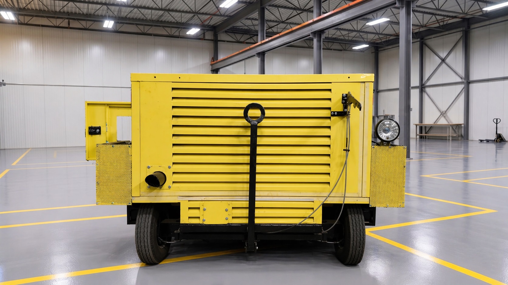 The rugged chassis and body structure are built from heavy-duty fabricated steel, ensuring durability in demanding environments. The unit is mounted on a trailer with integrated cable trays, fuel tank, and easy-access maintenance points. It is designed for mobility and ease of deployment in airports, airbases, and remote locations.