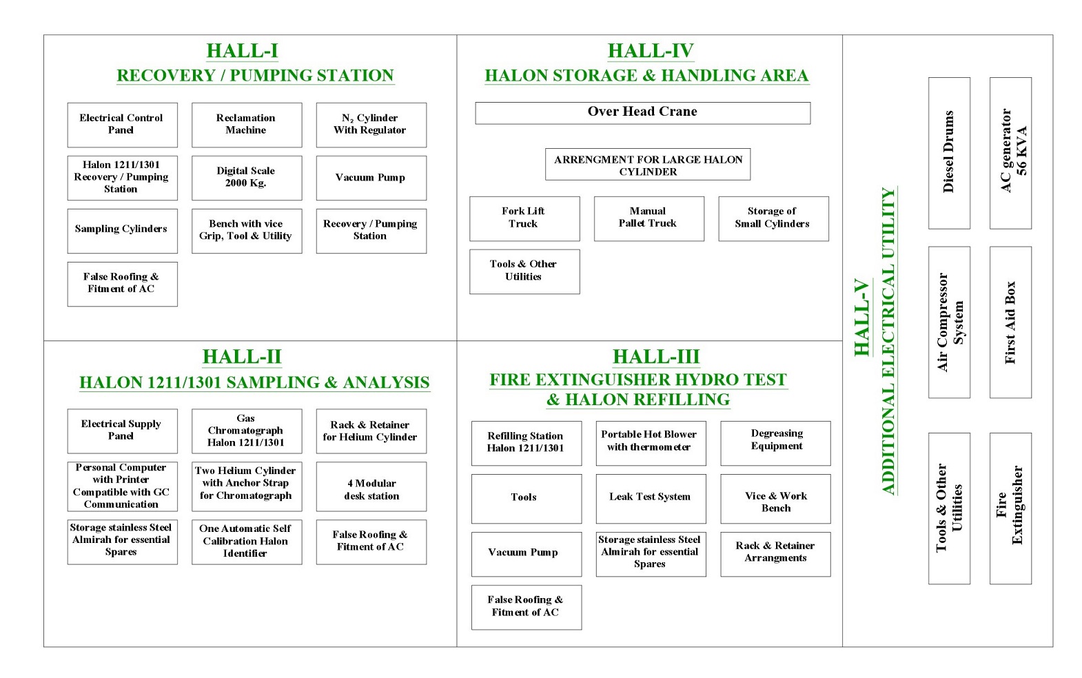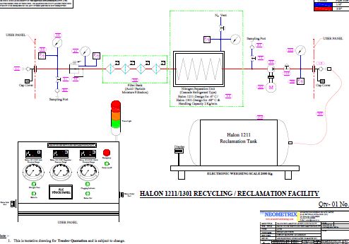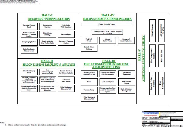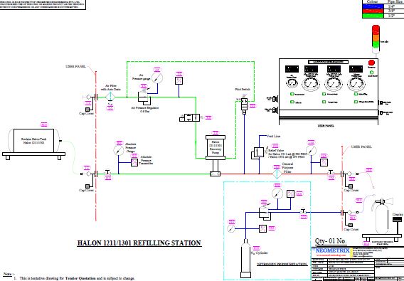 Introduction The Halon Reclamation & Refilling Facility (HRRF) by Neometrix Engineering is a fully integrated, turnkey solution engineered to recover, purify, and recharge Halon-1211 and Halon-1301 fire-suppression agents. At its core, the HRRF automates a closed-loop process: spent Halon is evacuated to deep vacuum, routed through three-stage filtration (acid removal, moisture trap with indicator, particulate filter), then through cascaded refrigeration (down to –70 °C for Halon-1301, –20 °C for Halon-1211) with non-condensable gas venting. An embedded PLC/HMI orchestrates every sequence with safety interlocks and real-time alarms, while IoT-enabled remote monitoring tracks pressure, temperature, flow, and purity to optimize uptime and lifecycle costs. Integrated gas chromatography, mass spectrometry, moisture titration, residue testing, and boiling-point analysis certify each batch to ISO 7201 and ASTM D7673, ensuring reclaimed Halon matches virgin stock in performance and compliance. Technical Specifications