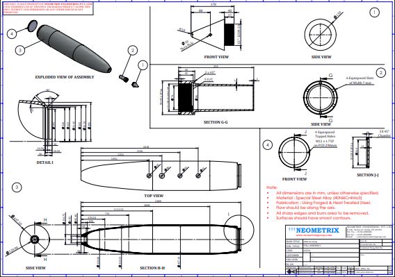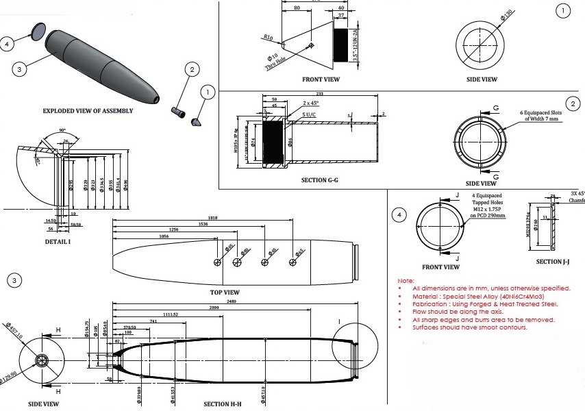 Introduction The MK-84 2000 lb Bomb Casing serves as the hardened steel shell for the U.S. Mark 84 general-purpose aerial bomb, the largest in the 1,000-series family introduced during the Vietnam War. With a nominal weight of 2,000 lb (actual weight 1,972–2,028 lb depending on fin and fuze configuration), it houses approximately 945 lb of high-explosive fill—typically Tritonal or PBXN-109—enabling a crater up to 50 ft wide and 36 ft deep upon detonation. The casing’s low-drag, streamlined profile and precise machining ensure compatibility with both unguided delivery and a variety of precision-guidance kits (e.g.,Paveway, JDAM), making it a versatile warhead across all-weather and all-altitude missions. Key Features • High-Strength Alloy Construction: Forged and heat-treated 40Ni6Cr4Mo3 steel provides a tensile strength of 1,100–1,250 MPa and Vickers hardness of 352–375 HV, balancing toughness and resistance to in-service stresses. • Aerodynamic, Low-Drag Design: Smooth, burr-free outer profile with flow-direction machining minimizes drag for stable, predictable ballistic performance. • Modular Compatibility: Six equispaced 7 mm slots and four M12 × 1.75 P tapped holes on a 290 mm PCD allow attachment of tail fins, guidance strakes, or handling fixtures—supporting variants from free-fall “dumb” bombs to GPS/INS “smart” munitions. • Full Traceability & QA: Each forging batch is accompanied by NABL-accredited chemical and mechanical test certificates; independent on-site sampling and testing are conducted if certificates are missing or incomplete. Technical Specifications