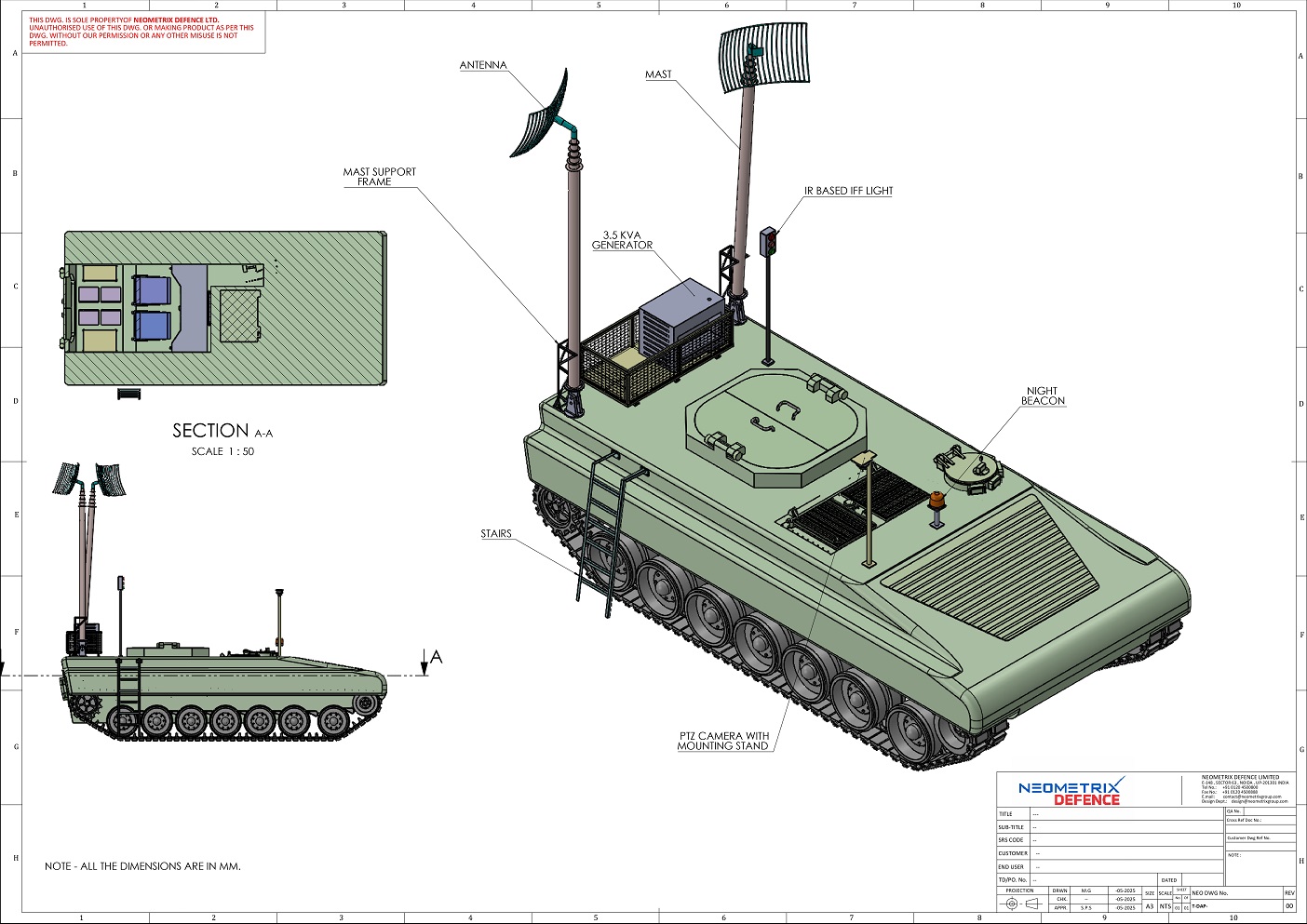 Introduction The Command-and-Control Carrier Motor Track (CCC-MT) is a specialized armored vehicle platform engineered to function as a mobile battlefield headquarters. In modern warfare, commanders must remain close to their troops while retaining full access to real-time communication, battle-management systems, and secure decision-making tools. The CCC-MT bridges that gap by combining the rugged mobility of an armored carrier with the advanced electronics and ergonomics of a command post. Traditionally, platforms like the M1165 Expanded-Capacity Vehicle (ECV) HMMWV have been adapted for command roles, owing to their robust chassis, crew-protection measures, and ability to host complex electronic suites. However, Neometrix Defence Limited undertook a significant step forward by transforming tracked carriers into fully networked mobile command hubs. This project involved extensive modifications across structural, environmental, electronic, and crew-centric systems, ensuring seamless integration of modern warfare technologies with battlefield survivability. The execution demanded not just engineering upgrades but also systems-level integration — marrying mechanical modifications with power-management, NBC protection, and ergonomic command layouts. The result was a holistically upgraded platform, capable of sustained operations in hostile environments, with resilience against electronic, environmental, and kinetic threats. Delivered Sub-Systems 1. Superstructure ModificationReinforced hull architecture to sustain added command loads. • Optimized roof and side panels for installation of antennas, surveillance masts, and electronic warfare sensors. • Enhanced ballistic resistance and structural rigidity to endure battlefield stresses. 2. Outer Body Fitments • Custom external mountings for modular gear and tactical storage. • Integration of external brackets for camouflage nets, field equipment, and auxiliary communication arrays. • Aerodynamic and structural refinements improving stability and protection in rough terrain. 3. Environmental Control System with Air Purification • Advanced HVAC integrated with Nuclear-Biological-Chemical (NBC) filtration. • Continuous supply of clean, temperature-controlled air for crew survivability in contaminated zones. • Redundant filtration units with low-maintenance cartridge replacement, designed for long endurance missions. 4. Command Center Fully configured battle-management hub with multiple operator workstations. • Ruggedized displays, encrypted communication consoles, and integrated data networking. • Ergonomic design enabling simultaneous operation by multiple officers for planning, monitoring, and decision execution. 5. Electronics and Power Management System Centralized electronic distribution backbone supporting all mission-critical subsystems. • Intelligent power routing with load prioritization — ensuring uninterrupted function of communications and life-support systems even under electrical fault conditions. • Scalable design allowing integration of future digital equipment and sensors without major redesign. 6. Modular Crew & Equipment Cabin Adaptive interior layouts with configurable racks and panels for different mission profiles. • Ergonomically optimized crew seating and secured stowage for sensitive equipment. • Noise and vibration dampening measures, ensuring reduced operator fatigue during prolonged missions. Technical Integration Highlights • Structural Engineering: Reinforcements carried out without compromising tracked mobility performance. • System Architecture: All sub-systems — command, HVAC, electronics, and modular interiors — were interconnected through a centralized architecture. • Scalability: Modular designs allow for quick upgrades in line with evolving battlefield technologies. Outcome With these modifications, Neometrix Defence Limited delivered a new-generation Command and Control Carrier that provides: • Operational mobility: battlefield commanders move securely with frontline forces. • Situational dominance: integrated communication and control tools for real-time decision making. • Crew survivability: NBC-protected, ergonomically safe workspace. • Future readiness: modularity and scalable electronics backbone for rapid upgrades. This project not only modernized tracked carriers into advanced command posts but also established Neometrix’s capability as a turnkey defence systems integrator, bridging mechanical engineering with battlefield digitization.