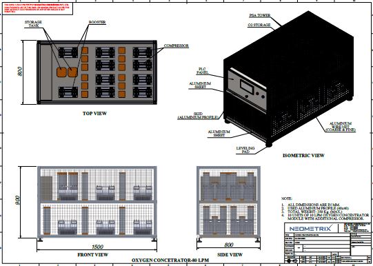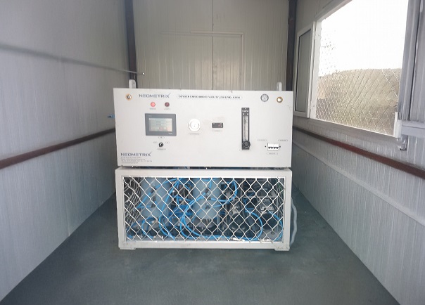 4. Automated Environmental Control • PLC-Based Closed-Loop Logic: Starts concentrators when O2 <27% and stops at 35%; triggers CO2 exhaust fans for 60 seconds when CO2 >3000 ppm. • User-Configurable Setpoints: Operators can adjust thresholds, schedules, and view historical logs via HMI. • Continuous Real-Time Monitoring: O2 and CO2 levels are updated every 2 seconds for responsive control. • Failsafe Logic Integration: In case of sensor failure, the system enters a predefined safe mode with alert triggers. • Data Logging: 24/7 environmental data archiving with USB export or cloud sync. • Multi-Zone Control (Optional): Manage oxygen levels across different rooms independently. 5. Distribution & Patient Interfaces • High-Pressure Oxygen Piping: Delivers gas at 4 bar through copper mains and PU tubing to wall nozzles mounted at 1 m height for uniform mixing. • Nasal Cannula Outlets: Dedicated ports for direct therapy, especially in the 80 LPM model. • Anti-Backflow Design: Check valves on all outlets to prevent contamination. • Custom Nozzle Placement: Can be configured for bunk beds or central flow diffusion. • Optional Humidifiers: Attachments available for comfort during continuous oxygen therapy. • Color-Coded Piping & Quick Couplers: For safe and easy operation. 6. Safety, Alarms & Redundancy • Overpressure Relief Valves (5 bar) • Emergency Stop Buttons • Redundant Sensors & Self-Diagnostics • MCBs & Surge Protection • Alarm Prioritization (Critical/Warning/Advisory) • Automated Purge Cycle during emergency shutdown • Compatibility with Fire Detection Systems • Low Voltage Disconnection Feature 7. Installation & Commissioning • Skid-Mounted with Caster Wheels for easy transport • Minimal Site Prep: PUF panels and modular doors/windows • Commissioning Protocols: Leak tests, purity validation, and operator training • Plug-and-Play Architecture: Pre-wired panels and jointed pipes • Weatherproof & Seismic Ready: IP-rated enclosures and seismic anchoring • Documentation Kit: Includes manuals, P&IDs, and maintenance schedules 8. Maintenance & Lifecycle Support • Filter Replacements: Every 6–12 months (pre-filters, moisture separators, bacteria filters) • Molecular Sieve Refresh: 3–5 year cycle based on duty hours • Remote Monitoring: Optional SCADA integration for predictive maintenance • Central Maintenance Dashboard: Part life tracking and service logs • QR Code-Based Lookup: Access part manuals and replacement info instantly • Field-Replaceable Modules: Designed for quick swaps with minimal tools 9. Customization & Scalability • Capacity Expansion: Network multiple units in parallel • Integration: Interfaces with BMS or field shelter controls • Alternate Power: Solar-hybrid or inverter backups • Multi-Unit Synchronization & Load Balancing • Altitude Calibration Kit: Adjusts compressor & sensor behavior by elevation • Multi-Language HMI Support • Occupancy-Linked Control (Optional) 10. After-Sales & Warranty • Two-Year Warranty: Covers compressors, PLC, and sensors • On-Site Support: Regional service centers • Training Packages: Certification courses for operators and technicians • Digital Support Portal: 24/7 access to documentation and service tickets • Remote Diagnostics (SIM-enabled module) • Spare Part Kits: Pre-stocked for remote site deployments • On-Demand Refresher Training Conclusion The Neometrix Oxygen Enrichment Facility combines cutting-edge PSA technology, automated control, and high-altitude engineering to deliver a turnkey solution for respiratory support in extreme environments. Its modularity, ease of use, and comprehensive support make it essential for defense, research, medical, and civilian applications at altitude.