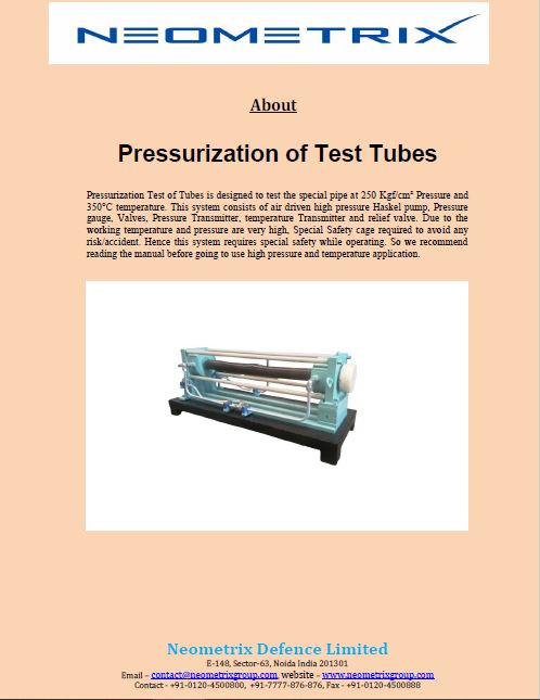 3. Operating Principle & Workflow 3.1. Specimen Mounting: Secure the test tube between insulated heater blocks and pressure-sealing end-fittings; verify thermocouple placement at mid-span. 3.2. System Checkout: Fill the SS-304 oil reservoir; inspect fittings; confirm cooling-water flow; test interlock status. 3.3. Pressure Ramp-Up: Evacuate air via bleed valves, then engage the Haskel pump to ramp at a programmable rate (e.g., 10 bar/min) to the setpoint. 3.4. Thermal Ramp & Dwell: Activate PID control to reach up to 350 °C; hold pressure and temperature for the specified duration (commonly 30 min). 3.5. Monitoring & Alarm Handling: Log pressure, temperature, and optional displacement (via LVDT) at ≥ 10 Hz; automatic alarms pause or abort tests on deviations. 3.6. Controlled Shutdown: Power down heaters, slowly vent pressure to avoid hydraulic shock, allow cooldown to < 50 °C, then disassemble. 4. Standards Compliance & Test Modes - Compliance Standards: - ASTM A312/A213: Proof-test seamless and welded stainless-steel tubes at 1.25× MAOP. - EN 10216-2: Steel tubes for pressure applications. - API 5L: Line-pipe hydrostatic test to 1.25× MAOP with permanent set limits. - Test Variants: - Hydrostatic Proof Test: Static pressurization to verify no leaks or permanent deformation. - Burst Test: Ramp until failure, capturing burst pressure and fracture mode. - Cyclic Fatigue Test: Automated cycling (± 10 % of MAOP at up to 1 Hz) to assess fatigue life. - Helium Leak Detection (Optional): Mass-spectrometer integration for sensitivity < 10−5 mbar·L/s. 5. Advanced Automation & Reporting - Recipe Management: Store and recall multiple profiles with per-step ramp rates, dwell times, and alarm criteria—ideal for production sampling and R&D studies. - Real-Time Data Acquisition: High-speed logging (≥ 10 Hz) of all analog inputs; configurable alarm setpoints trigger interlocks or HMI alerts. - Reporting & Traceability: Generate standardized PDF/CSV reports with time-stamped data, calibration certificates, and operator notes; export directly from HMI or PC. 6. Installation, Calibration & Support - Site Requirements: - Electrical: 415 VAC ±10 %, 50 Hz, 3-phase, 20 A breaker. - Utilities: 6 bar dry, oil-free compressed air; cooling-water inlet/outlet; gravity drain. - Factory Acceptance Test (FAT): Pre-shipment validation against client protocols for pressure, temperature, control logic, and safety interlocks. - On-Site Commissioning: Installation by Neometrix engineers, instrument calibration, and operator training covering operation, safety, and maintenance. - Maintenance & Calibration: Annual calibration of gauges/transmitters; quarterly inspection of seals, O-rings, and heater cartridges. Spare kits ensure < 24h downtime. 7. Customization & Future Upgrades - Higher-Pressure Intensifiers: Upgrade to 400–600 bar capability for high-strength alloys. - Extended-Range Heating: Inert-gas-purged ceramic heaters up to 500 °C for oxidation-sensitive materials. - Multi-Specimen Fixtures: Rotary or manifold designs allow sequential testing of up to four tubes without teardown, boosting QA throughput. 8. Applications - Aerospace & Defense: Qualification of hydraulic and fuel-line tubes under flight-cycle pressures and temperatures. - Power Generation & Oil & Gas: Creep and burst testing for steam-generator tubing, subsea pipelines, and high-pressure process lines. - Nuclear & Research: R&D of new alloy compositions and geometries, plus compliance testing to RCC-M and ASME BPVC. 9. Conclusion The Neometrix Tube Pressurization Test Setup delivers end-to-end capability—from precise pressure and temperature control through automated data acquisition and reporting—within a modular, safety-certified platform. Compliant with all major international standards and easily upgradable, it provides engineers and QA teams the confidence and flexibility needed for material qualification, R&D exploration, and production validation in today’s most demanding applications. Future-proof your testing infrastructure with Neometrix’s comprehensive solution, designed to evolve alongside your technical challenges.