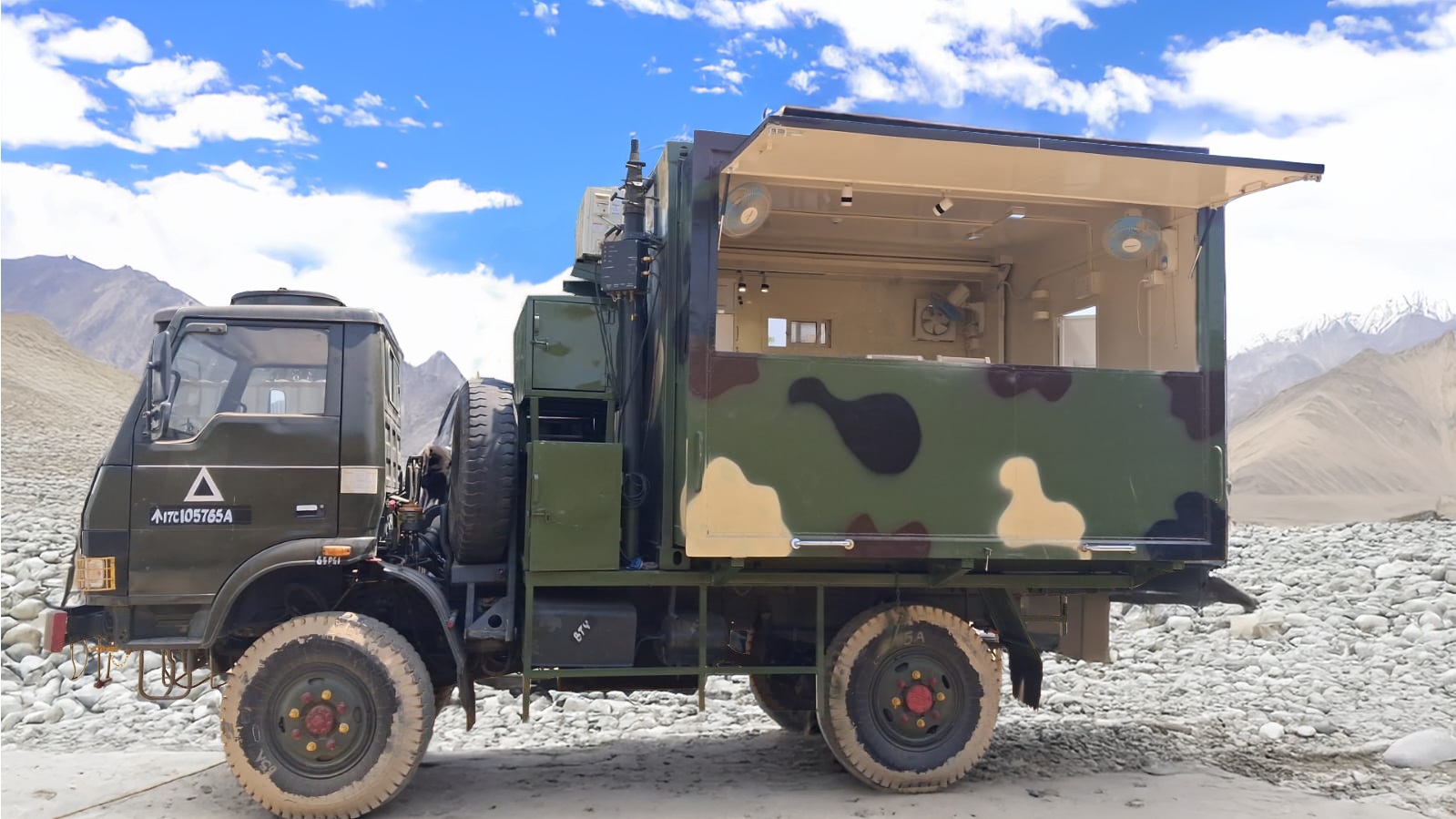 1. Introduction Modern battlefields are complex, fast-moving, and heavily dependent on secure communication and coordination. Artillery regiments in particular require real-time information, rapid fire-control decisions, and continuous communication with higher headquarters and deployed batteries. Traditional tent-based command posts are often limited by poor weather protection, lack of mobility, and vulnerability to electronic or physical threats. The Vehicle-Mounted Expandable Battery Command Post (BCP) solves these challenges by providing a mobile, protected, and fully equipped command centre that can move with artillery units into forward areas. It is built on a TATA 2.5 Ton GS vehicle and houses a containerised expandable shelter that opens up on the battlefield to create a spacious working environment. This system is essentially a “war room on wheels” – equipped with: • Power generation so it can function without external electricity. • Communication infrastructure including fibre optic networking and tactical radios for secure, long-range connectivity. • Telescopic masts for mounting antennas and surveillance equipment. • Climate control and safety systems to keep the crew safe and effective. • Ergonomic furniture and storage for operators, weapons, computers, and communication gear. Once deployed, the BCP becomes the nerve centre for artillery operations, allowing commanders to direct fire missions, coordinate with higher HQ, and maintain secure connectivity even in remote or hostile environments. For a layman: Imagine a fully air-conditioned mobile office, loaded with computers, radios, and communication gear, which folds out on the battlefield and allows a team of officers to command artillery fire. It is rugged enough for military use, safe against environmental hazards, and mobile enough to keep up with frontline units. 2. System Overview The Battery Command Post (BCP) is designed as a self-contained, rapidly deployable tactical headquarters. Unlike static command centres, it is mounted on a rugged TATA 2.5 Ton GS vehicle platform, ensuring mobility and quick repositioning during dynamic operations. Key Functional Elements: Expandable Modular Shelter The heart of the BCP is a containerised cabin with expandable side walls and reinforced flooring, which creates additional working area once deployed. The shelter is insulated, durable, and painted in military camouflage for concealment and protection against harsh weather conditions. Power Independence A 2.5 KVA silent generator supplies onboard electricity, backed by an AC/DC power distribution system and battery bank. This ensures continuous power for communications, climate control, and tactical systems even in power-denied environments. Communication Infrastructure With Optical Line Terminal Equipment (OLTE), 1000m of Optical Fibre Cable (OFC), and secure tactical radios, the BCP ensures real-time, encrypted connectivity with higher HQ, artillery batteries, and external networks. Mast Systems The system includes two telescopic masts: o A 10m pneumatic mast for heavy antenna arrays, radios, or surveillance equipment. o A 3m multipurpose mast for lighter devices and quick deployment. Ergonomics and Crew Comfort Designed for six operators, the interior is equipped with foldable workstations, chairs, server racks, gun racks, and storage cupboards. A 1-ton AC unit, exhaust fans, and LED lighting ensure comfort and safety during long missions. 3. Technical Specifications Below is a comprehensive table capturing the key technical aspects of the BCP system: